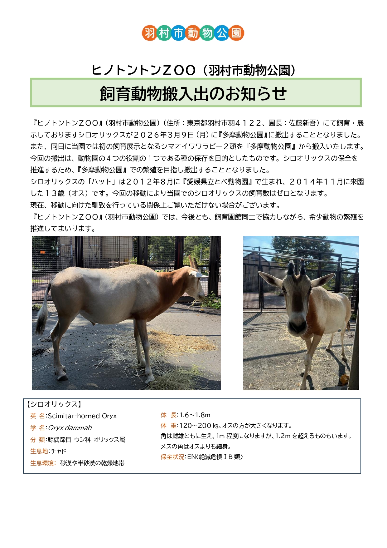【飼育動物搬入出】のおしらせ